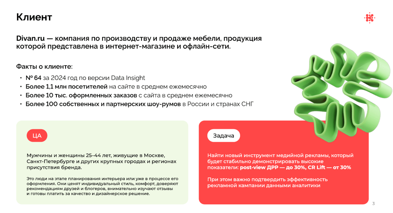 Перед Divan.ru и агентством Kokoc Performance (входит в Kokoc Group) стояла задача найти новый инструмент медийной рекламы, который бы стабильно демонстрировал высокие показатели post-view ДРР (доля рекламных расходов) — до 30%, и CR Lift (Conversion Lift — увеличение количества конверсий) — от 30%. При этом важно было подтвердить эффективность рекламной кампании данными аналитики.