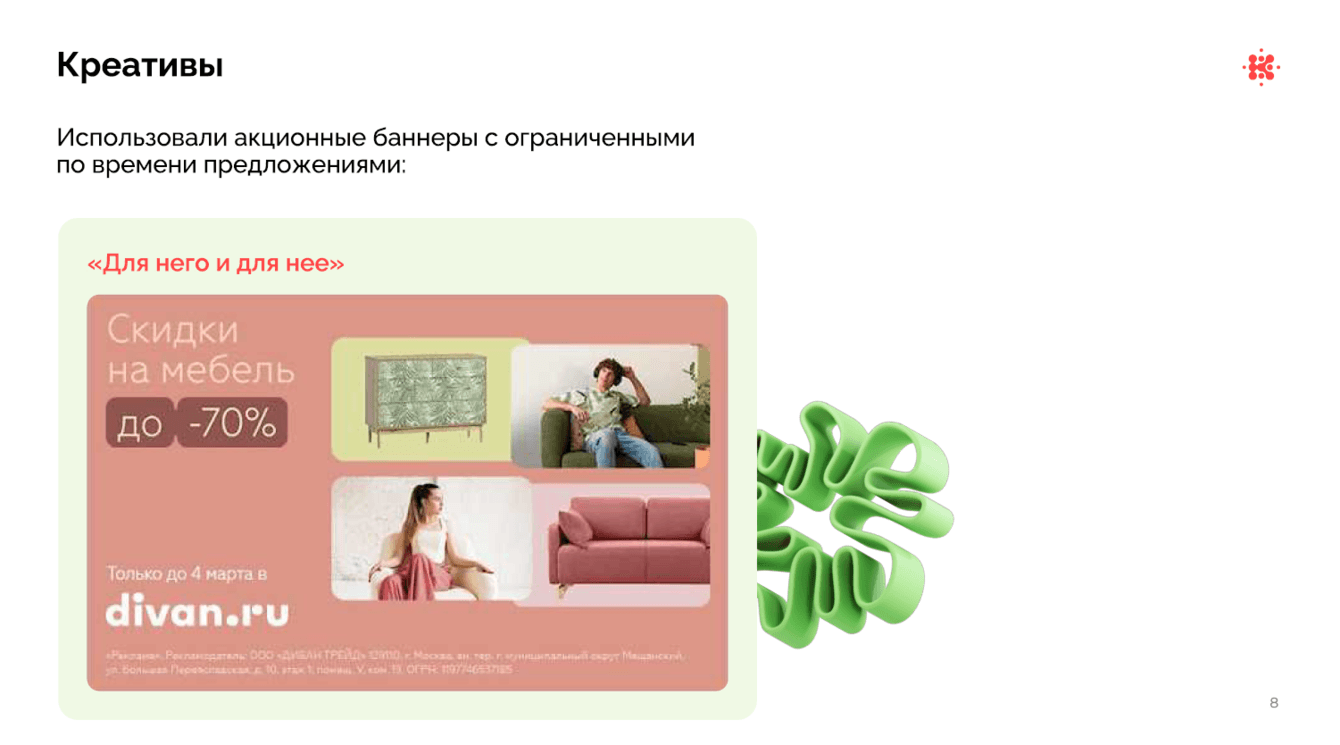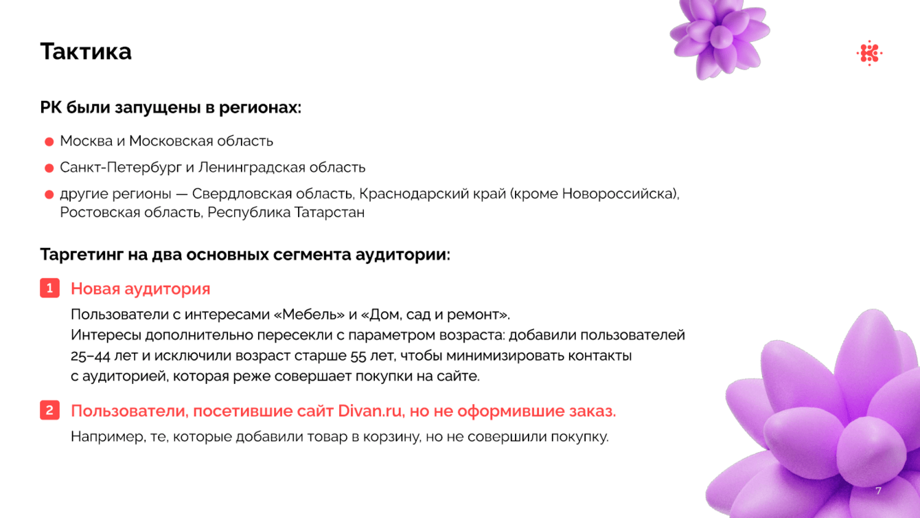 Использование МТС DSP в кампании Divan.ru подтвердило эффективность автоматизированного подхода к программатик-рекламе. Ключевым фактором успеха стала грамотная настройка сегментов аудитории и креативов. Мы разбили таргетинг на новые потенциальные сегменты и ретаргетинг по посетителям сайта, максимально концентрируясь на тех, кто уже проявил интерес. Оптимизация ставок и постоянный мониторинг показателей CTR и post-view ДРР позволили нам эффективно перераспределить бюджеты и добиться стабильного роста конверсий. Такой комплексный подход в сочетании с поддержкой рекламной платформы помог нам превзойти плановые KPI и получить впечатляющий CR Lift свыше 30%.