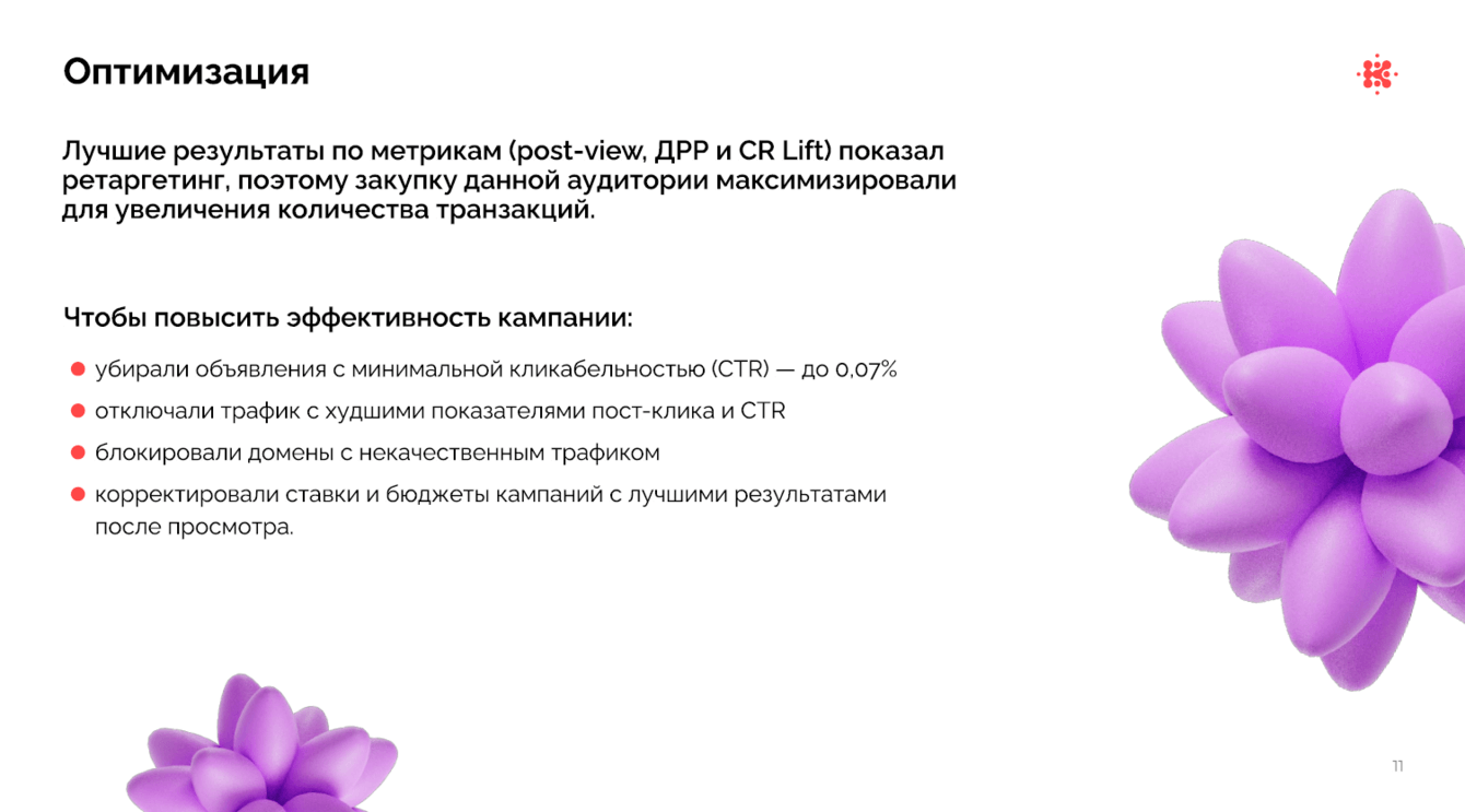 Лучшие результаты по метрикам (post-view, ДРР и CR Lift) показал ретаргетинг, поэтому закупку данной аудитории максимизировали для увеличения количества транзакций.