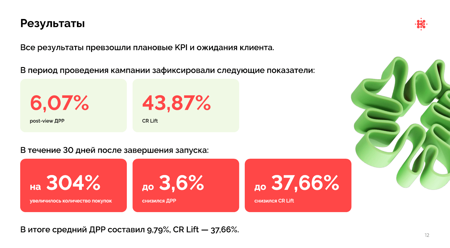 Использование МТС DSP в кампании Divan.ru подтвердило эффективность автоматизированного подхода к программатик-рекламе. Ключевым фактором успеха стала грамотная настройка сегментов аудитории и креативов. Мы разбили таргетинг на новые потенциальные сегменты и ретаргетинг по посетителям сайта, максимально концентрируясь на тех, кто уже проявил интерес. Оптимизация ставок и постоянный мониторинг показателей CTR и post-view ДРР позволили нам эффективно перераспределить бюджеты и добиться стабильного роста конверсий. Такой комплексный подход в сочетании с поддержкой рекламной платформы помог нам превзойти плановые KPI и получить впечатляющий CR Lift свыше 30%.