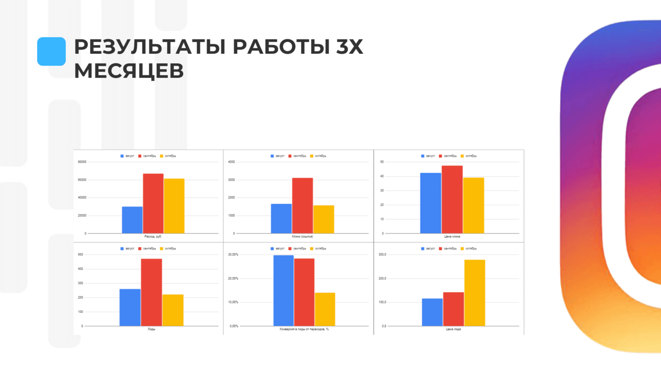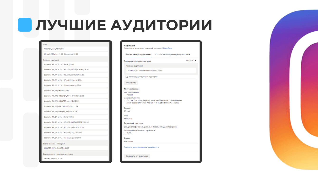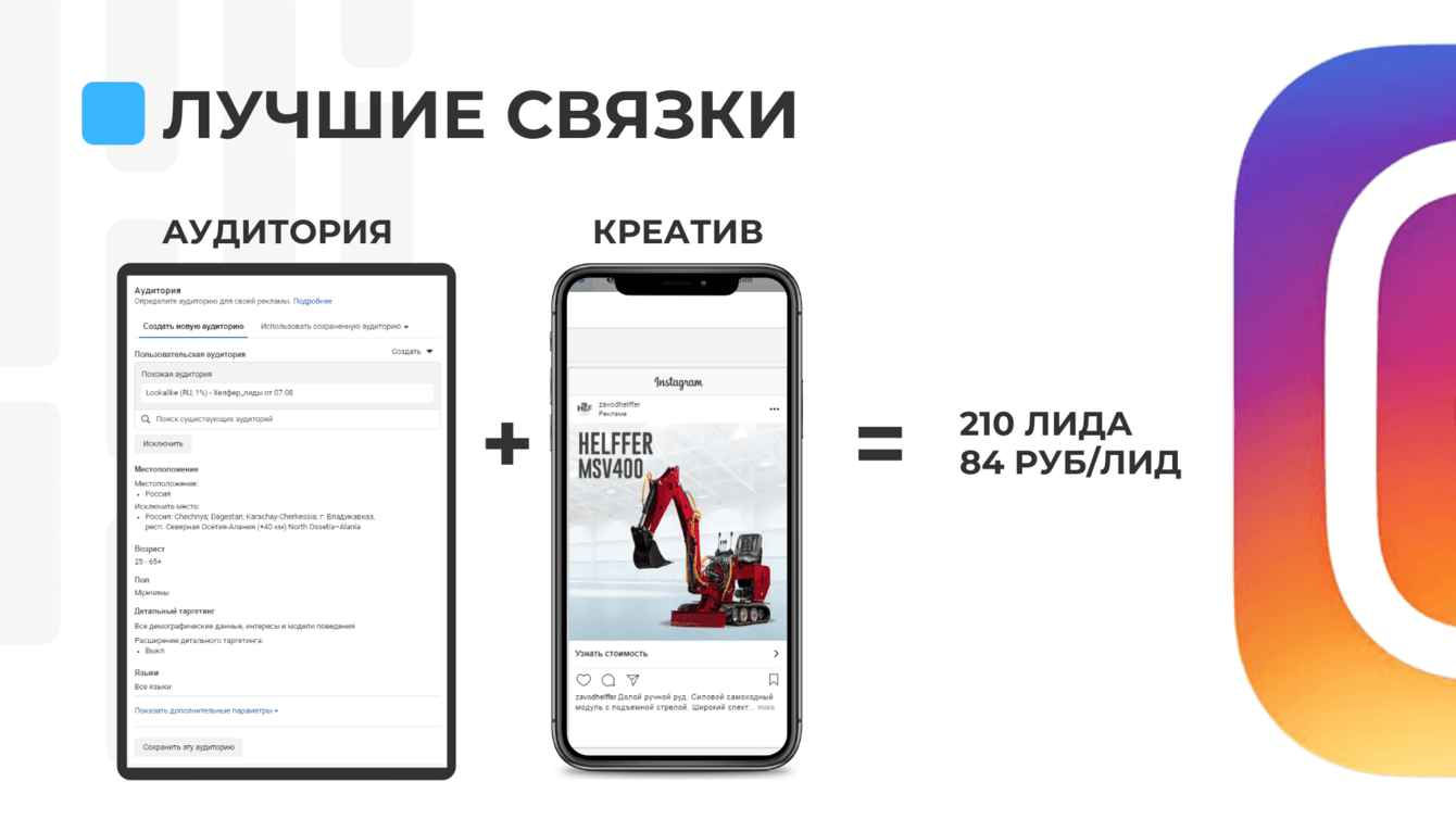 В результате рекламной кампании мы выявили лучшие аудитории и связки креативов, что позволило клиенту получить 174 лида по 168 рублей и 210 лидов по 84 рубля.