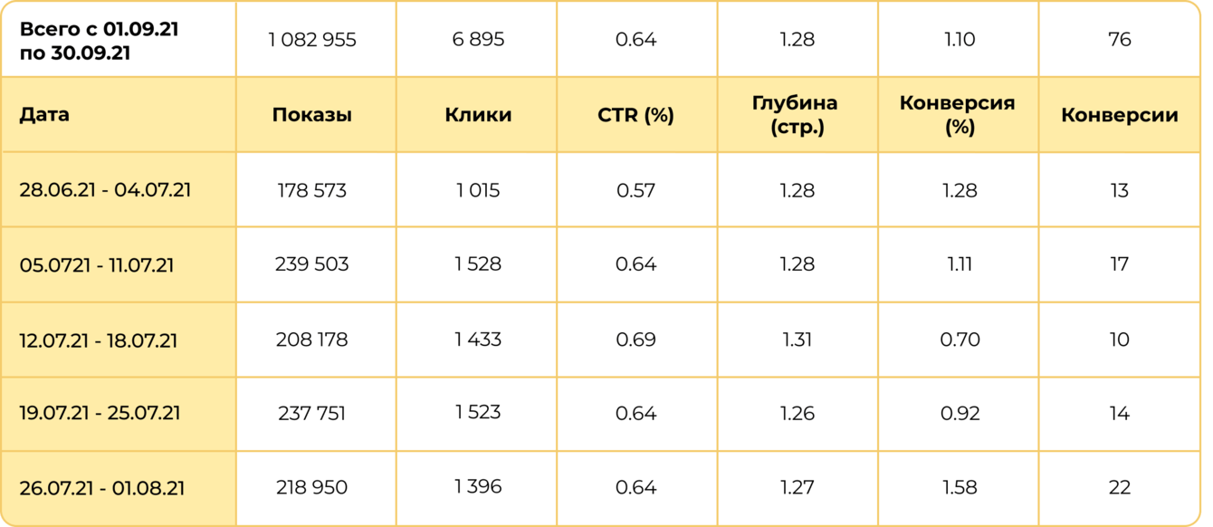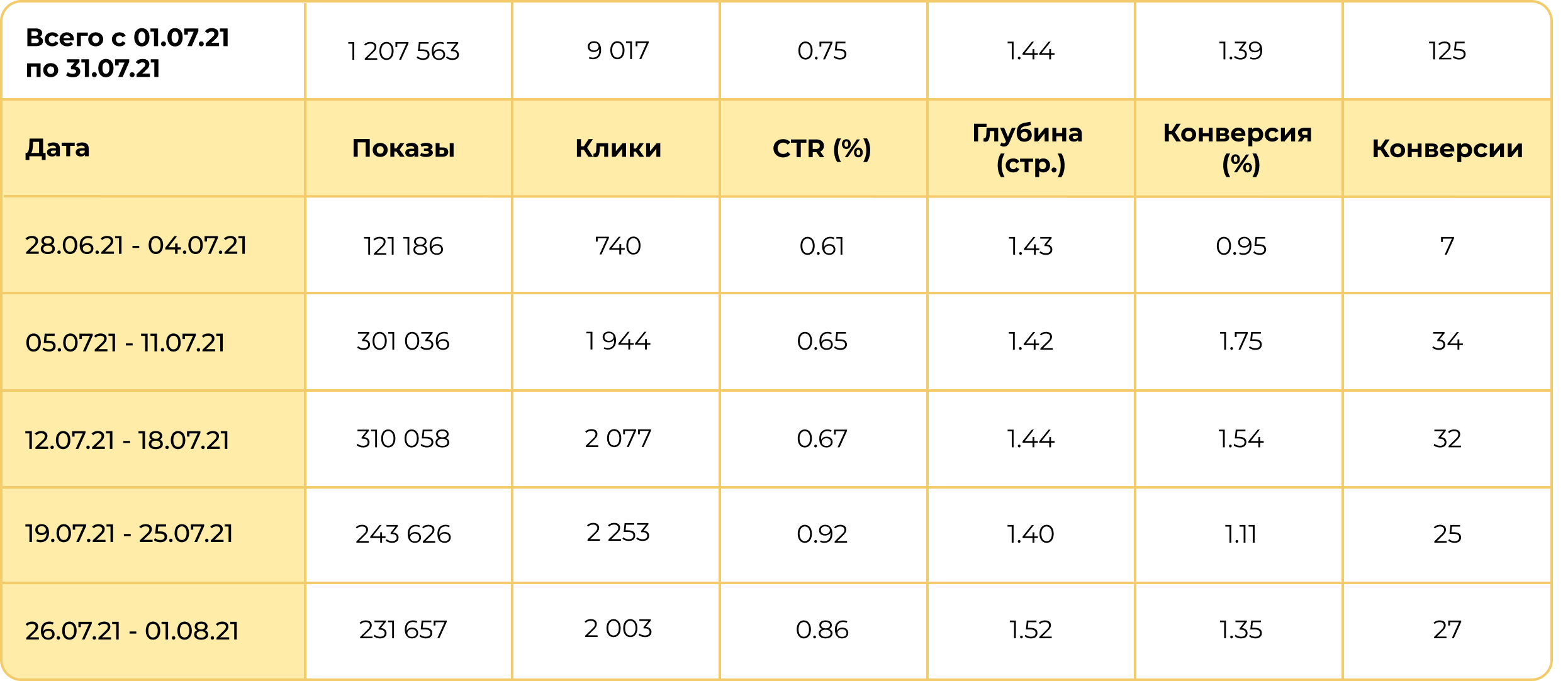 ✔ Рост конверсий с 0,3% до 1,2% после перенастройки целей и оптимизации;