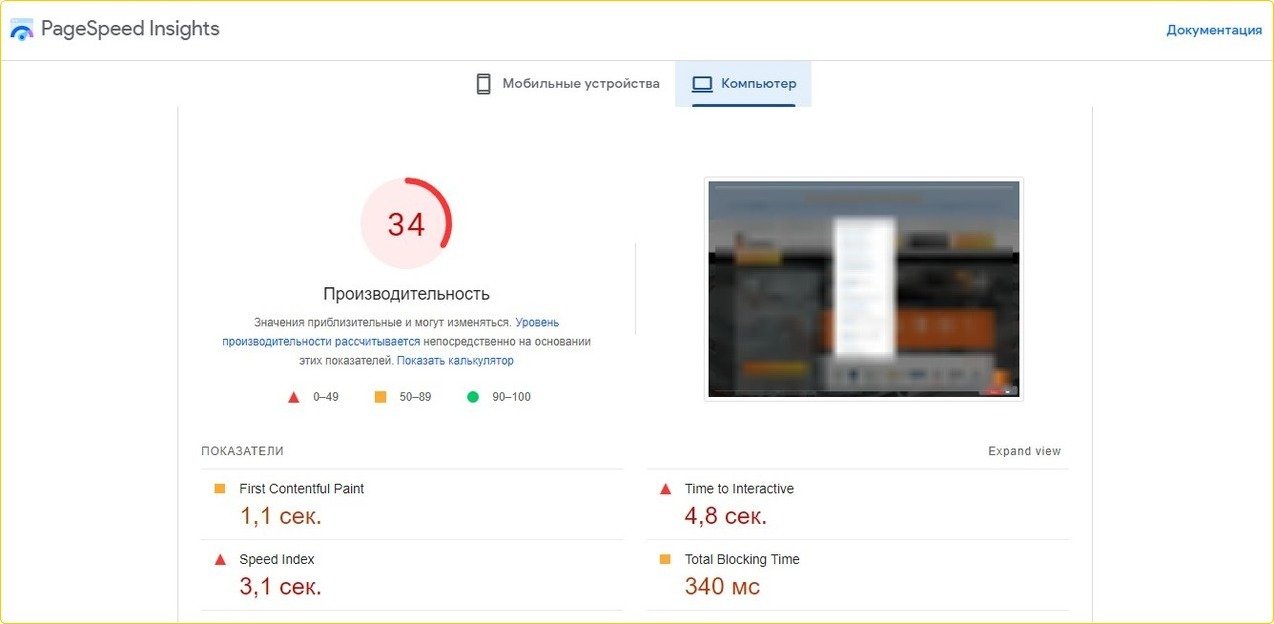 Проанализировали загрузку сайта — PageSpeed: 34/100.