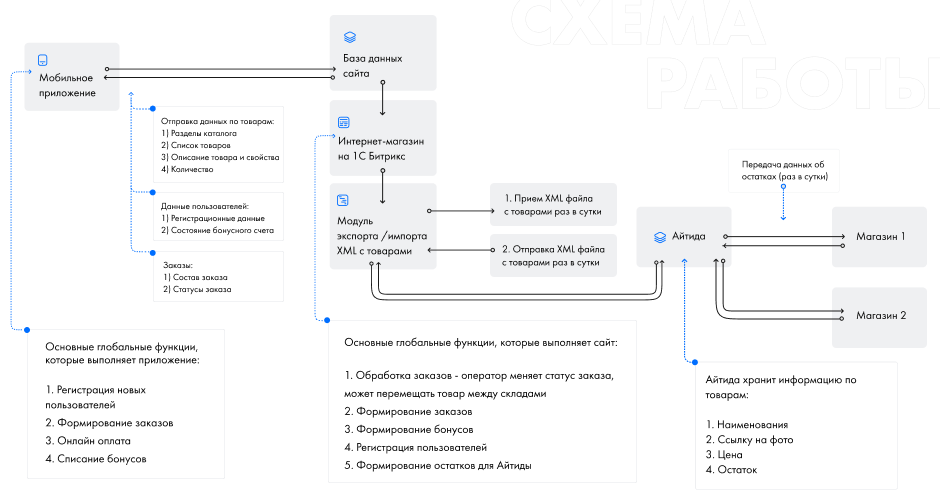 В розничных магазинах в Краснодаре клиент вел учет товаров в программе «Айтида». Нам нужно было поддерживать актуальную информацию по наличию товаров и остатов в интернет магазине, двух приложениях и 14 офлайн магазинах
