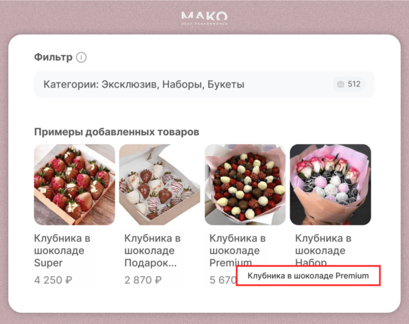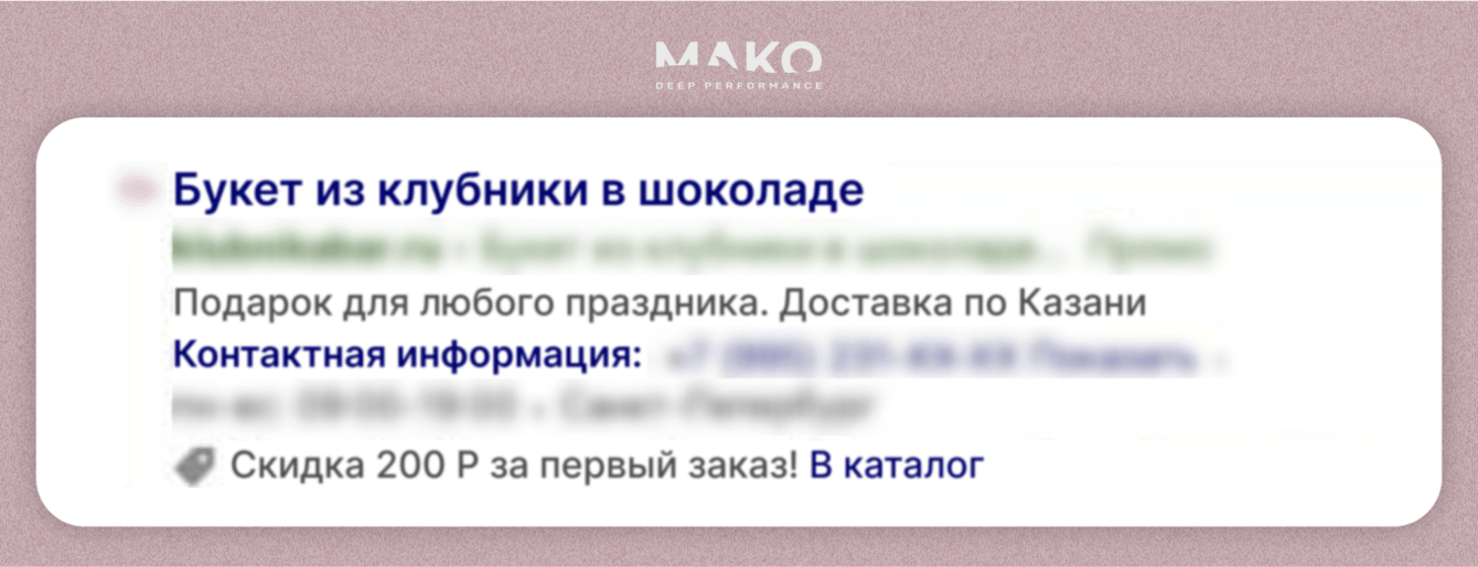 Казалось, эстетичные фото букетов из клубники тоже привлекут внимание пользователей. Поэтому делали ставку и на товарную галерею ― карусель с фото, названиями и ценами товаров, которая формируется над результатами поисковой выдачи. В таком формате могут показываться разные типы объявлений: товарные, текстово-графические, категорийные по фиду. Они более стандартизированы, креатив не нужен ― текста минимум.