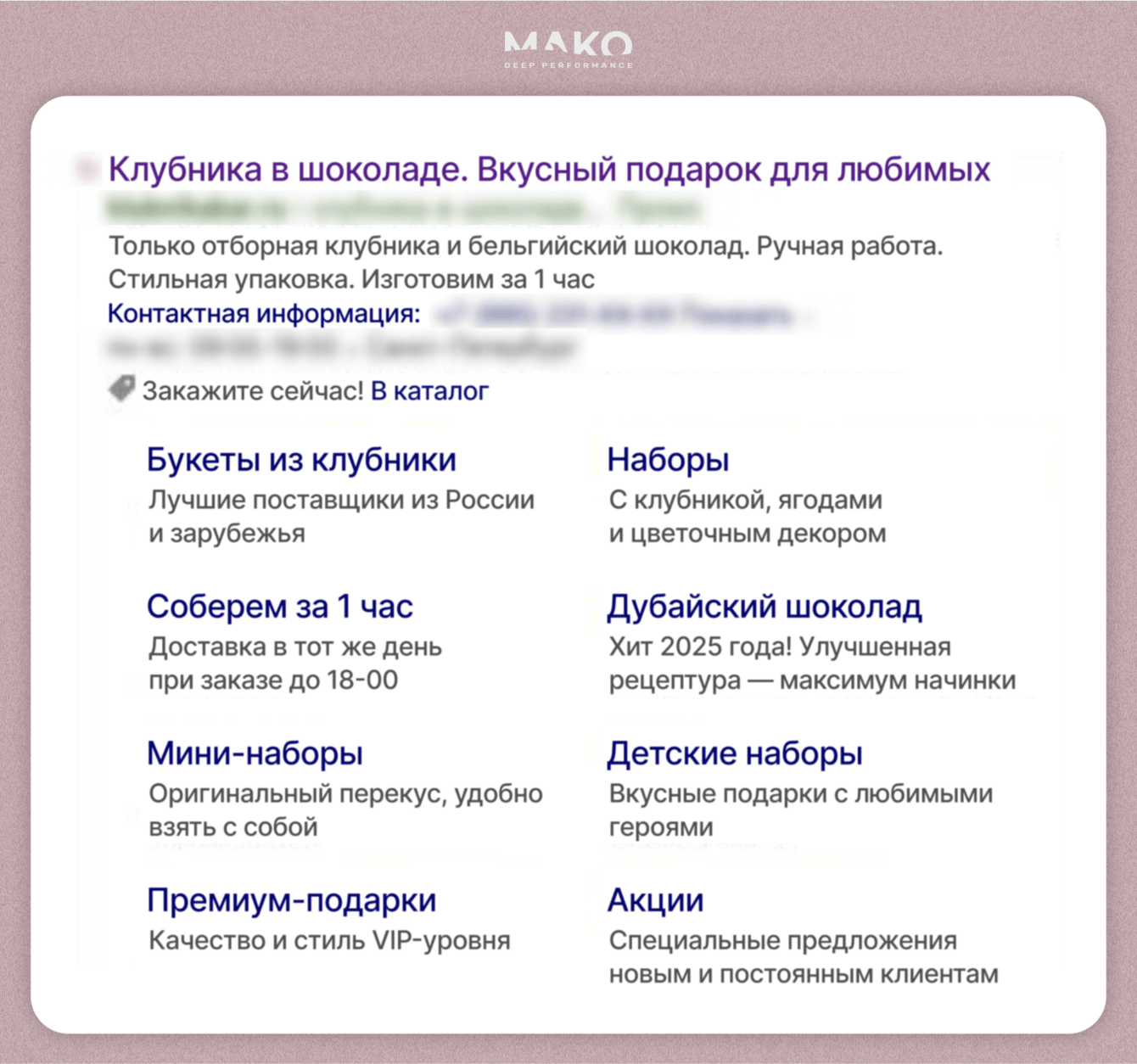 — Эмоциональные креативы. Писали в текстах объявлений «клубника в шоколаде ― тренд 2025 года», «роскошный подарок для тех, кто вам дорог».