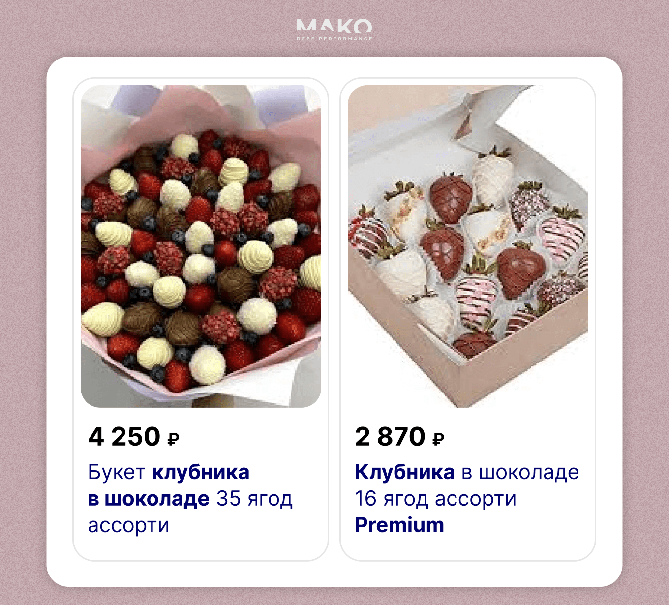 — Эмоциональные креативы. Писали в текстах объявлений «клубника в шоколаде ― тренд 2025 года», «роскошный подарок для тех, кто вам дорог».