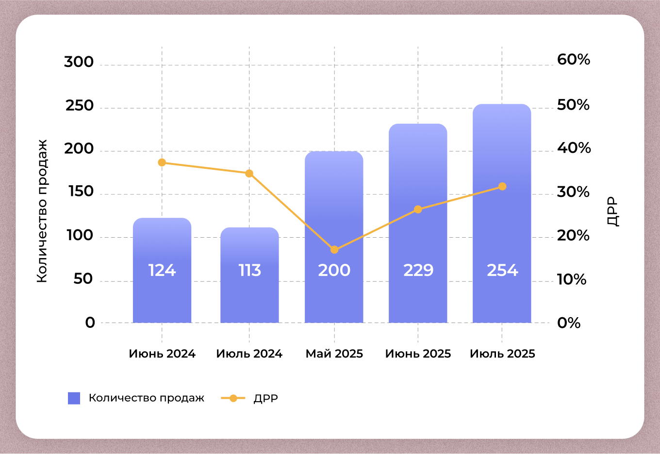 По сравнению с летом 2024 года продажи выросли в 2 раза. ДРР остался в рамках 35%, а в среднем составил 25%.