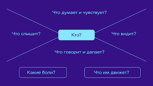 Карта эмпатии помогает глубже понять потребности клиента: что он думает, чувствует, говорит, делает.