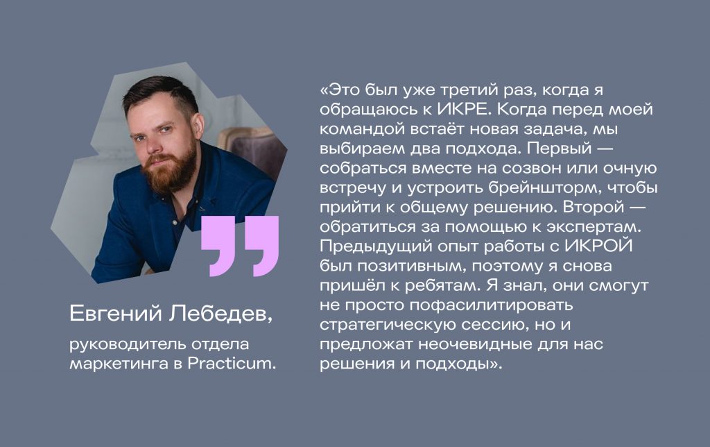 ИКРА помогает бизнесам находить новые точки роста, создавать и пересматривать продуктовый портфель и стратегию. В декабре 2022 года к нам за экспертизой обратилась компания Яндекс.Практикум, чтобы мы помогли проработать общие стратегические и маркетинговые задачи, выступить в роли фасилитаторов встречи и найти новые бизнес-решения.