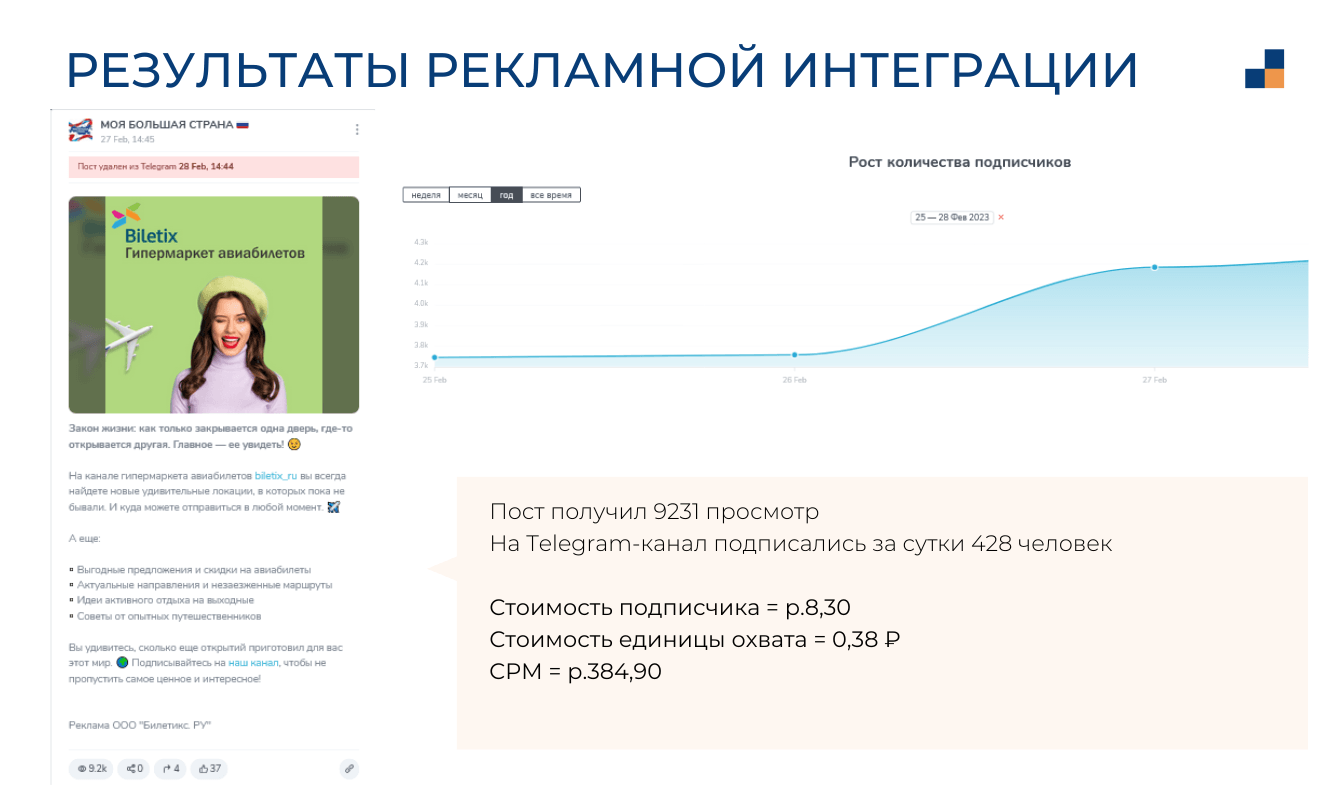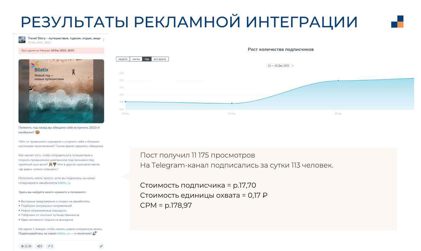 Всего было опубликовано 24 интеграции в Telegram-каналах с упоминанием брендов клиента. Со слов клиента было замечено значительное повышение трафика на сайт из социальных сетей. Далее будут приведены примеры некоторых интеграций и их результаты