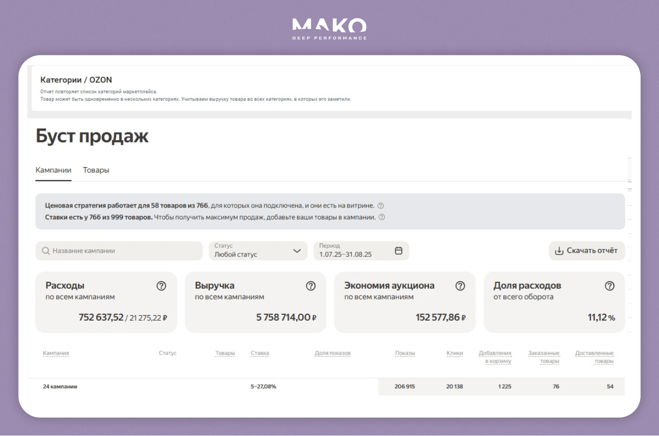 Общий ДРР всех кампаний буста продаж составил 11,2%. За 2 месяца получили 76 заказов.