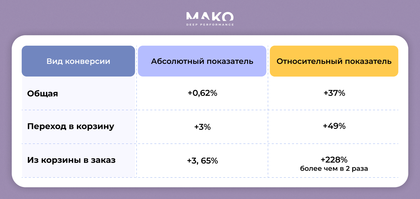 Запустили кампании на брошенные корзины: пользователям предлагали промокод на скидку 8%, если они вернутся и завершат заказ. Дополнительно получили 8 продаж.