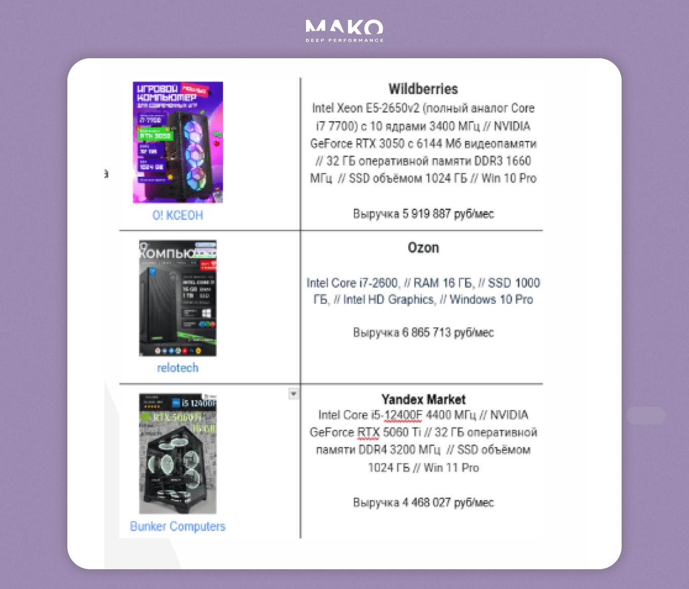 Увидели, что топовые модели на разных маркетплейсах отличаются по назначению. Если на WB и Яндекс Маркете лидеры рейтинга позиционируются как игровые компьютеры с высокой производительностью, то на Ozon лучше всего продаются офисно–школьные модели с меньшей производительностью и набором предустановленных офисных программ. Следовательно, селлеру надо делать акцент на игровых ПК.