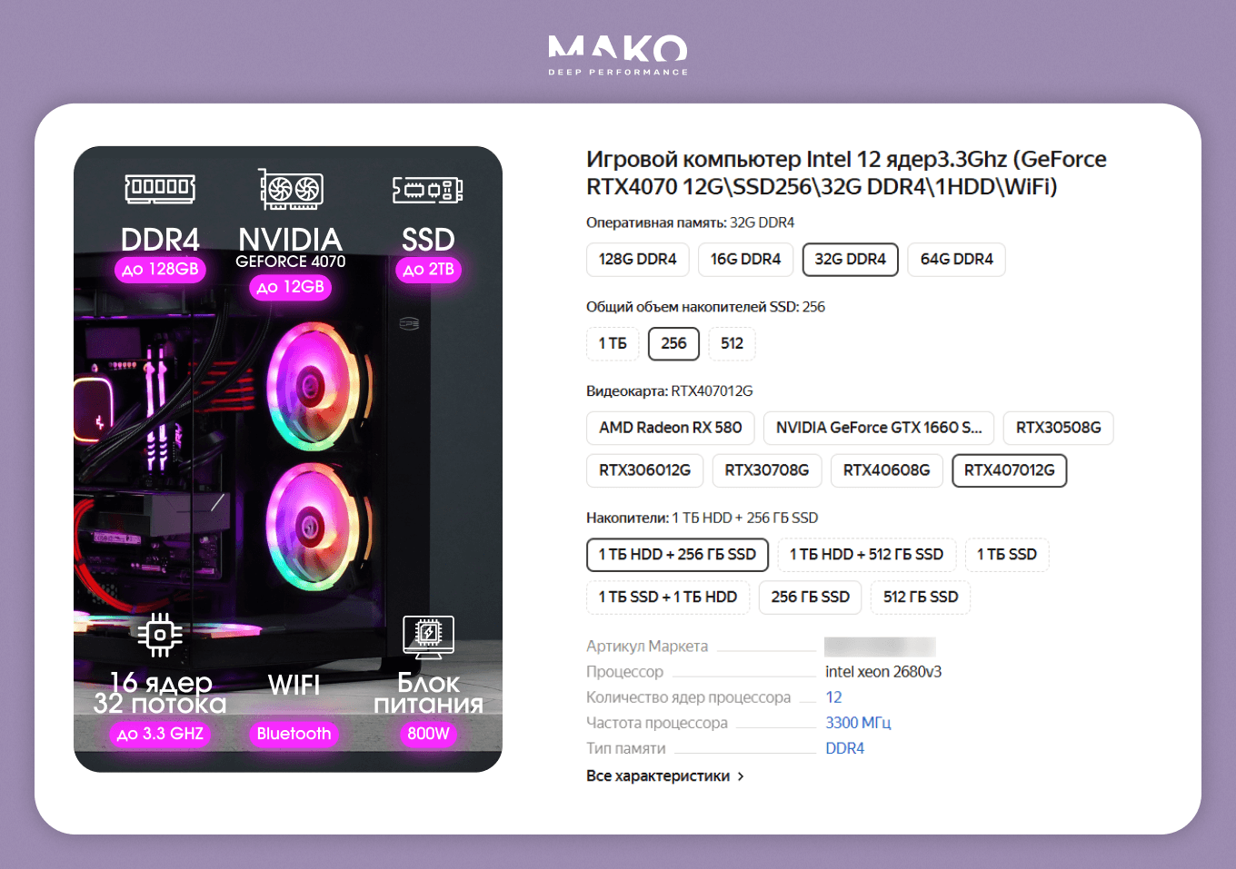 Игровые компьютеры так продвигать нельзя: они теряются на фоне аналогов. Мы внедрили в карточки графическую воронку Amazon, которая позволяет дать покупателям максимум информации о товаре и последовательно ответить на вопросы, возникающие при выборе: