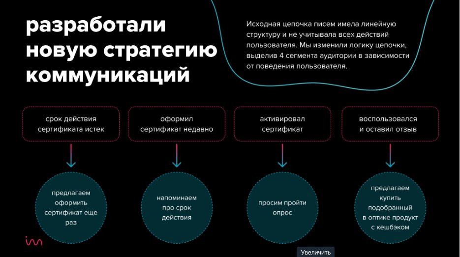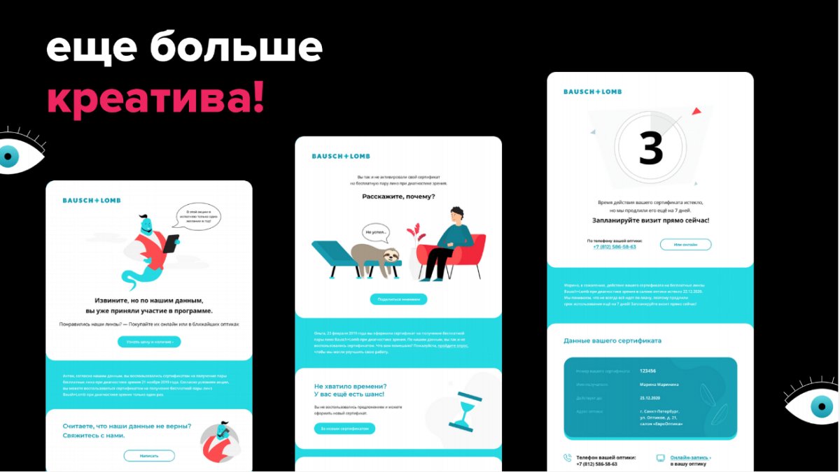 Часть клиентов так и не дошли до салона оптики и не активировали сертификат. Их мы возвращали к необходимому целевому действию через регулярную email рассылку. Выделили эту аудиторию в сегмент, вставили в письма специальный блок с информацией о статусе сертификата и призывом к действию. Еще мы дополнительно отправили письма с уведомлением о том, что сертификат можно продлить и воспользоваться им в удобное время.