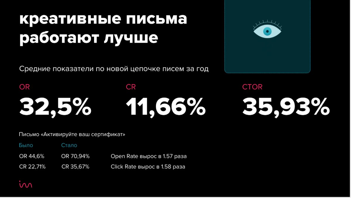 Именно креативные решения в email-маркетинге позволили нам добиться отличных результатов. Мы сделали ставку на визуальные креативы, так как изображения позволяют донести до аудитории больше информации в кратчайшие сроки. Через визуальный ряд мы точнее считываем эмоции, воспринимаем картинку с учетом пережитого опыта, а также мгновенно находим в памяти прошлые взаимодействия с брендом.