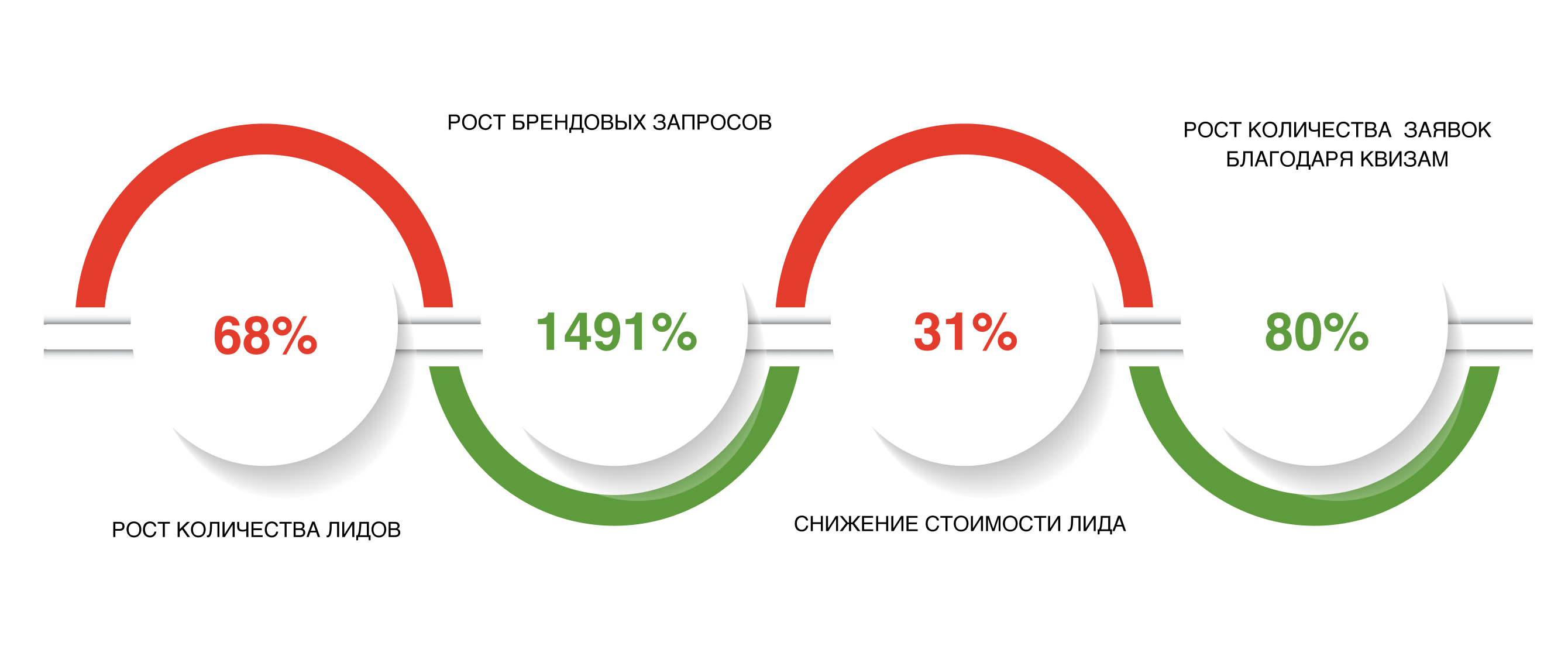 - Увеличение заявок через квизы: до 80% всех лидов.