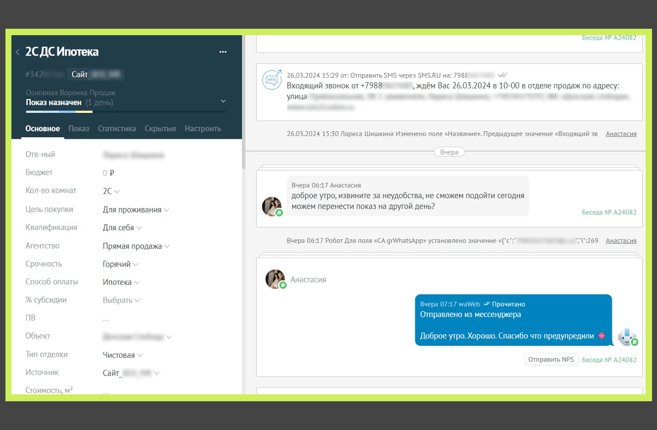 У клиента — крупного застройщика с хорошей маркетинговой воронкой — шли заявки из Яндекс.Директ. Трафик был целевой: сработали креативы, промо, квизы. Но уже через пару недель после запуска воронка начала "проседать": звонки были, заявки шли, а сделок — почти не добавлялось.