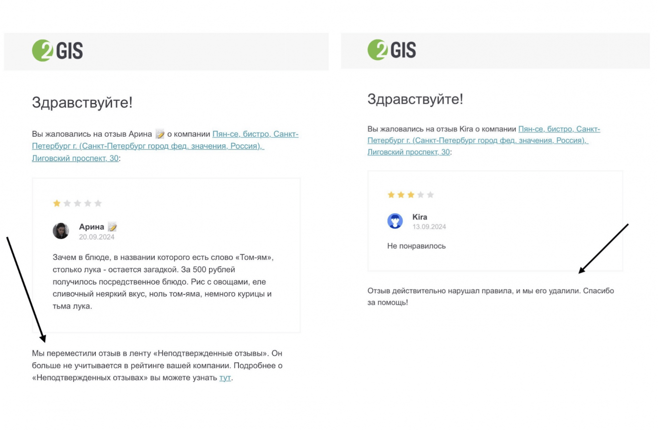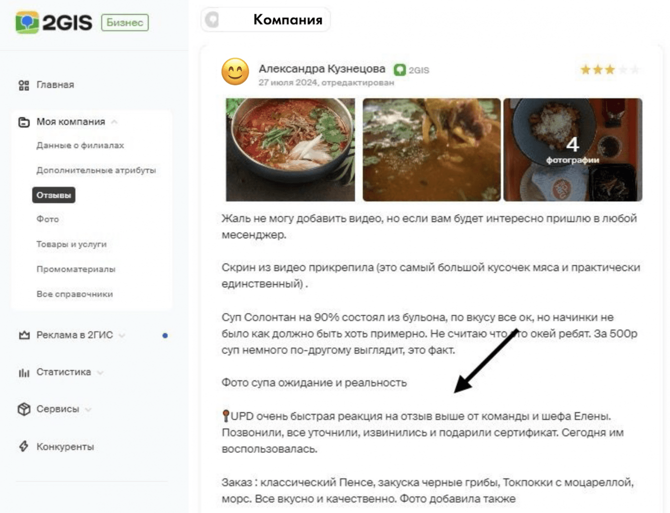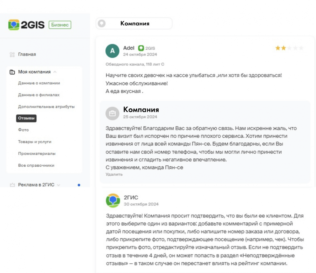 Этот метод имеет свои нюансы, так как 2GIS не удаляет отзыв по просьбе компании без наличия убедительных доказательств того, что услуги этому клиенту не предоставлялись или само мнение некорректно. Отзыв может быть удалён в том случае, если высказывания в них нарушают Правила сайта-агрегатора или признаны клеветой в установленном законом порядке.