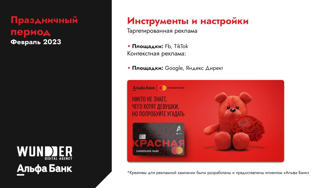 ЗАО "Альфа-Банк" сотрудничает с Wunder Digital Agency в области интернет-рекламы с 2016 года. За этот период Wunder Digital Agency оказывало услуги по настройке, аналитике и оптимизации медийной и performance-рекламы, лидогенерации для физических лиц.