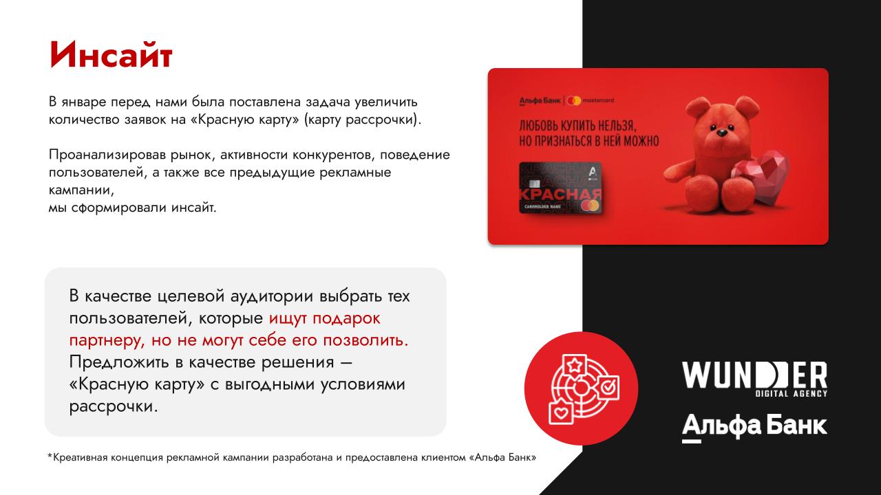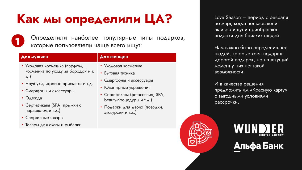 Из этого вывода вырос инсайт: в качестве целевой аудитории необходимо выбрать тех пользователей, которые уже ищут подарок партнеру, однако пока не могут себе его позволить. В качестве решения — предложение «Красной карты» с выгодными условиями рассрочки.