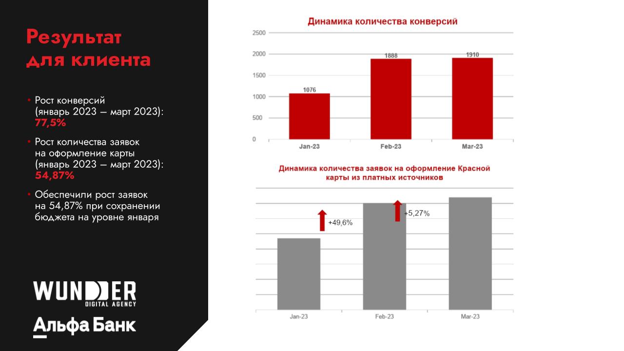 Несмотря на то, что главный инфоповод относился больше к февральскому празднику, рост количества заявок не остановился и в марте. В целом же число конверсий (отправок формы на оформление заявки) относительно точки отсчета (январь 2023) выросло на 77,5%. За февраль и март пользователями было осуществлено 1910 и 1888 отправок формы, соответственно. Рост же на следующем шаге воронки продаж — количество заявок на оформление карты — составил 54,87% за два месяца. И все это при сохранении бюджета на уровне января.