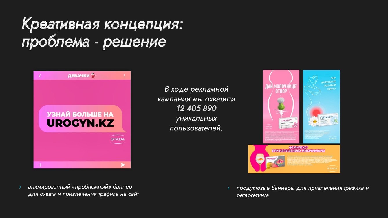 2. Специфика выбора препарата заключается в том, что гинекологические препараты обычно назначают врачи или же их покупают по рекомендации. Поэтому для достижения поставленных целей нам было важно найти способ отстроиться от основных конкурентов, привлечь целевую аудиторию, привести их на посадочную страницу препарата и убедить в покупке.