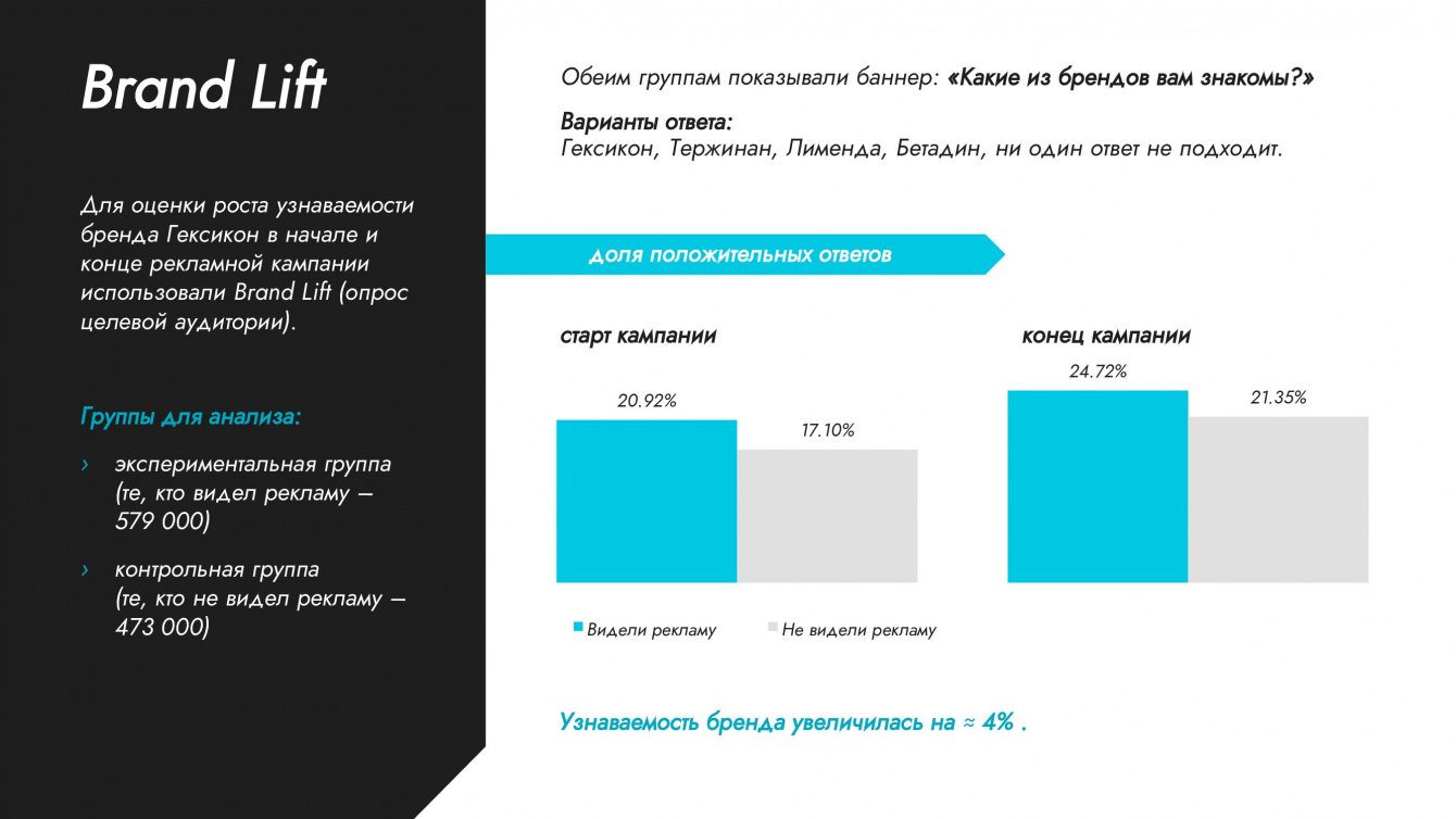 Для оценки роста узнаваемости бренда «Гексикон» в начале и конце рекламной кампании мы использовали Brand Lift — исследование, которое проводится с помощью опроса целевой аудитории.