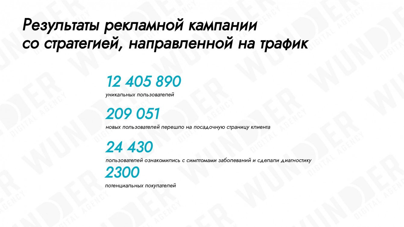 По результатам рекламной кампании, направленной на трафик, 209 051 новых пользователей перешло на посадочную страницу клиента. 24 430 пользователей ознакомилось с симптомами заболеваний и прошло диагностику. 2 300 пользователей стали потенциальными покупателями.