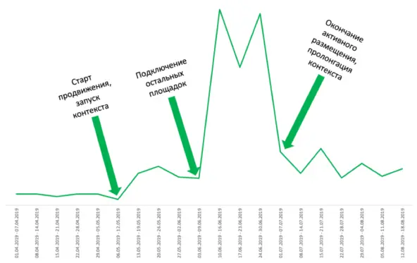 Наименее эффективным было размещение нативной рекламы (ТГБ в текстах релевантных статей), в одном случае – по причине высокой стоимости клика, в другом случае – по причине невысокой эффективности взаимодействий с сайтом клиента.