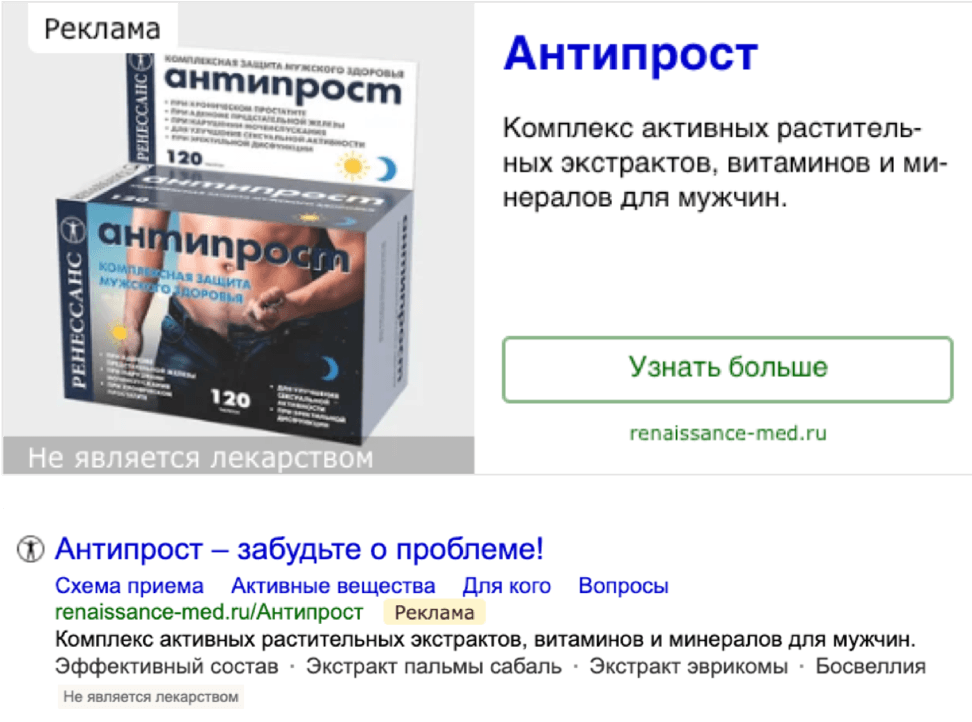 Мы не могли писать о лечебном действии и упоминать болезни, однако говорящее название препарата удачно упростило задачу. Мы придумали несколько вариантов текстов, и в процессе размещения оценивали эффективность и оставляли в размещении только наиболее результативные.