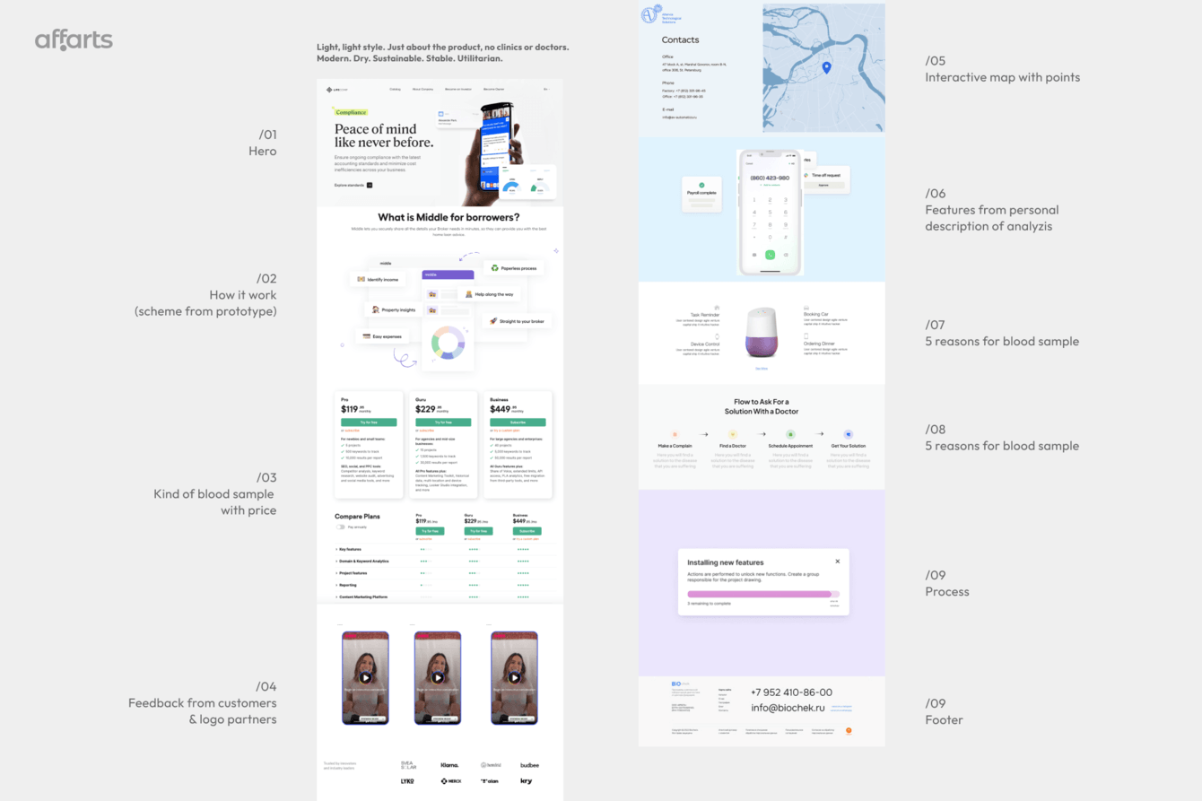 Для этого надо было сделать новый лендинг, на котором каждый сможет быстро и понятно заказать анализы. Заказчик планировал лить на него трафик с рекламы. Старая главная страница не подходила из-за ряда проблем: