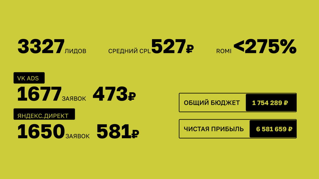 Для проверки спроса мы начали с минимальных бюджетов, протестировали лид-формы и уже на этом этапе увидели хороший отклик. После этого масштабировали рабочие связки в VK ADS и Яндекс Директ, перераспределили бюджет на каналы с наибольшей отдачей и выстроили систему дальнейшего тестирования.