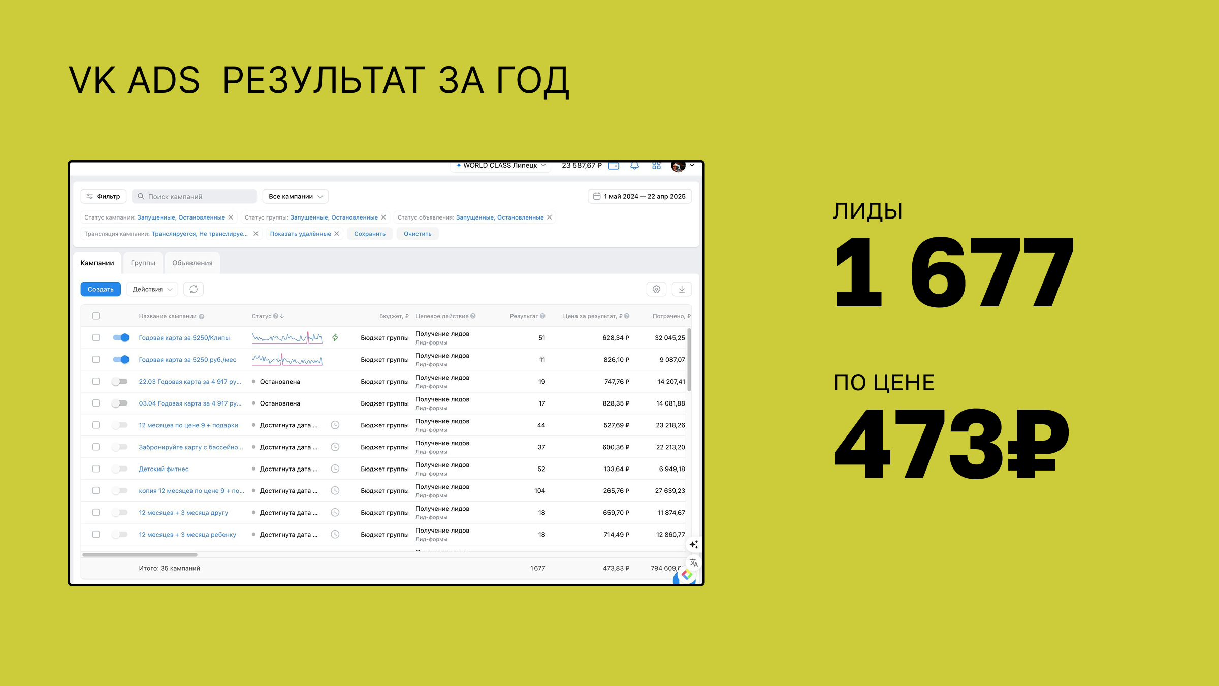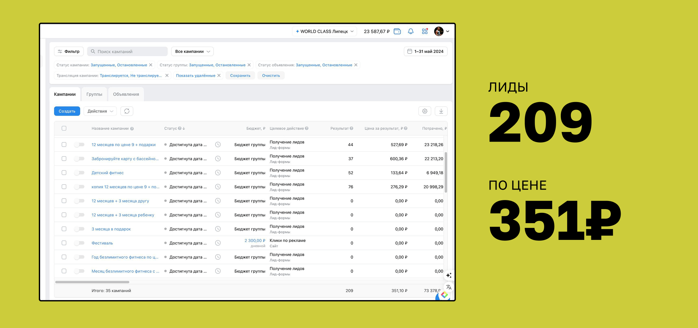 World Class Липецк на момент начала наших отношений столкнулся с типичной для ниши фитнеса проблемой: при ограниченном рекламном бюджете привлекать новых клиентов становилось все сложнее — лидов было мало, а их стоимость — слишком высока.