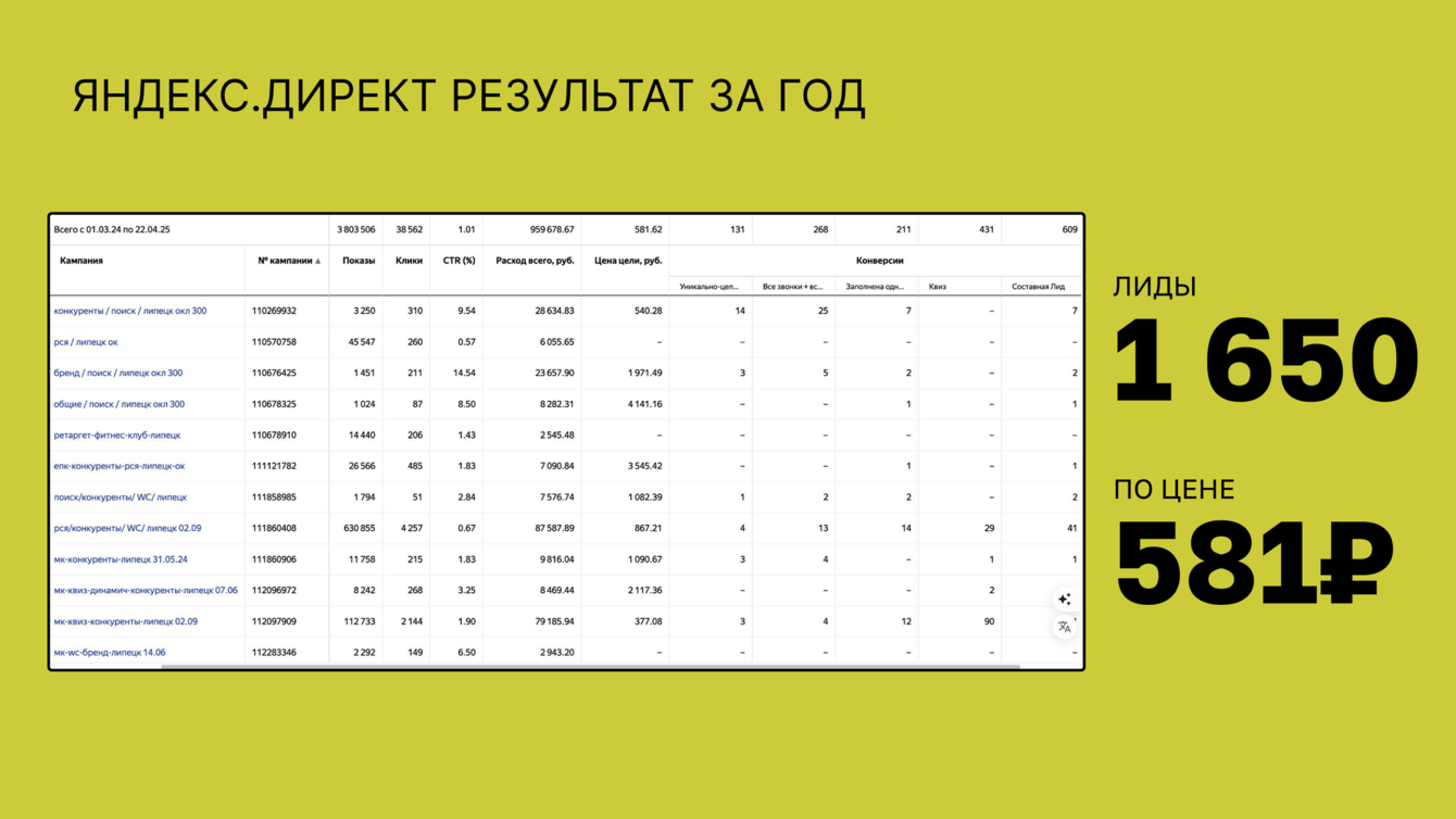 Результат не заставил себя ждать — за весь год, с учетом оптимизаций и маневров, средняя стоимость лида составила 581 ₽.