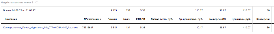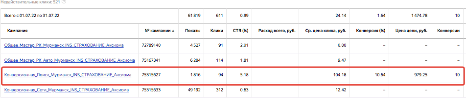 Так как основная цель проекта – заявки в отдел продаж, неэффективные компании были отключены, и мы решили сфокусировать весь бюджет на конверсионной поисковой компании с ключами «КАСКО», «ОСАГО», «ОСАГО Мурманск» и пр.