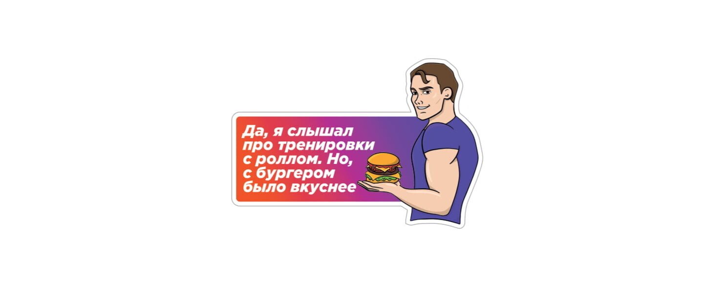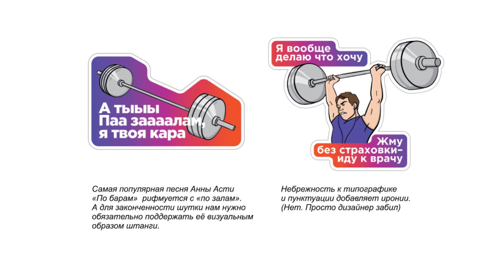 Возможно, некоторые из вас возразят, что читатель может изначально принять слово ролл за еду — тогда ожидание не будет разрушено и шутка провалится. Действительно, так может быть, но здесь на нас работает контекст: эти стикеры будут дарить спортсменам, которые несколько раз в неделю занимаются фитнесом. А значит, их сознание, определённое бытием (спорт, фитнес, скакалка, гантель, ролл и так далее), с большей вероятностью считает значение, удобное нам. С суши-мастером эта шутка бы не сработала. Или сработала, но её нужно переделать наоборот — предложите свой вариант в комментариях.
