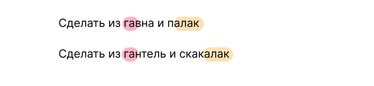 Красная пара совпадает по слогам, а вот жёлтая — нет. В идеале должно быть примерно так: «Сделаем из гантель и скалок». Но приходится жертвовать точной рифмой в угоду продуктовости.