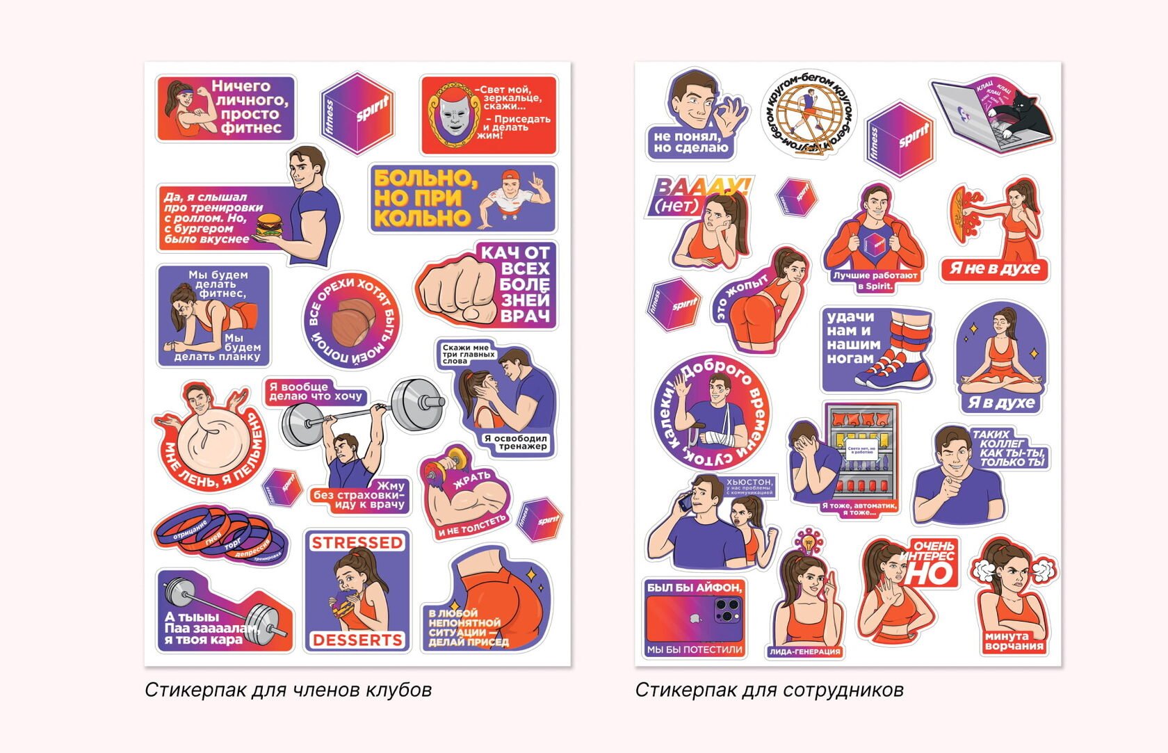 Spirit. Fitness постоянно придумывает ивенты и челленджи, а участников нужно чем-то награждать. Подумали, что кроме абонементов и шейкеров было бы неплохо дарить что-то эмоциональное, например, стикерпак. Мы в агентстве сделали 2 стикерпака: для клиентов и для сотрудников.