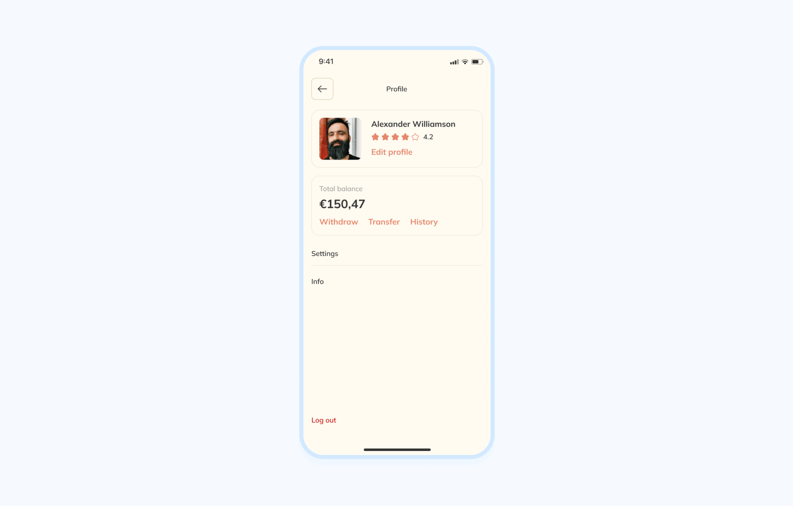 ◾️ Управление финансами отображается на странице профиля. Отсюда юзер может перейти к флоу вывода средств, переводам и просмотру истории транзакций.