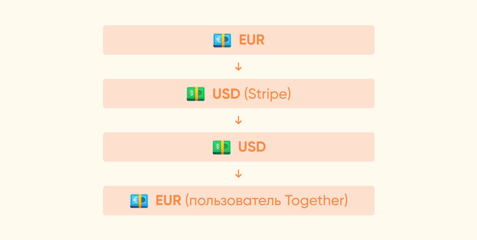 Когда клиент оплачивает со своего долларового счета в Stripe, система конвертирует евро в доллары для обработки платежа, а затем снова переводит доллары в евро, чтобы отправить средства пользователю Together, чей счет в евро