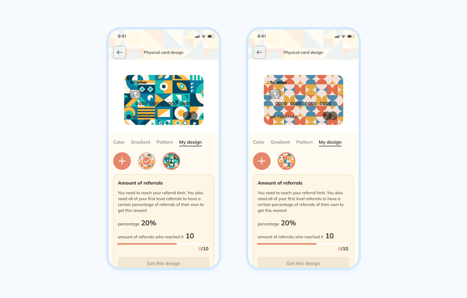 Еще в Together предусмотрена реферальная программа для пользователей. Можно пригласить в приложение друга и получить баллы, которые потом конвертируются в деньги. Также это дает возможность кастомизации QR-кодов или дизайна физической карты для оплаты…стоп, физическая карта для оплаты?