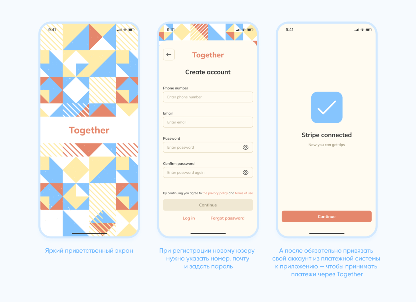 Так проект стал более масштабным и продолжительным. Кроме того, мы помогли заказчикам с подготовкой промо-материалов. Но обо всем по порядку — давайте посмотрим, как устроено и выглядит приложение Together, и пройдемся по основным флоу.