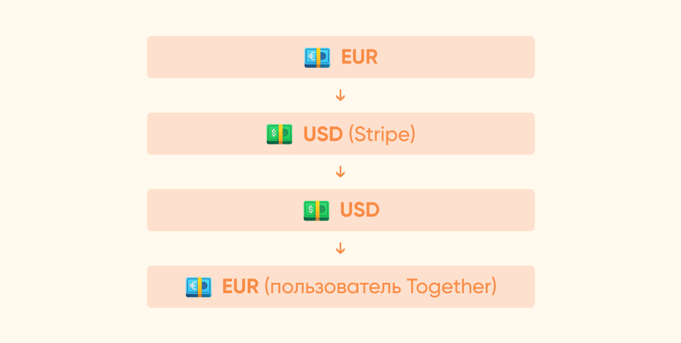Например, если счет в Stripe в долларах, евро сначала будут конвертироваться в доллары, а затем обратно в евро для передачи пользователю в Together.