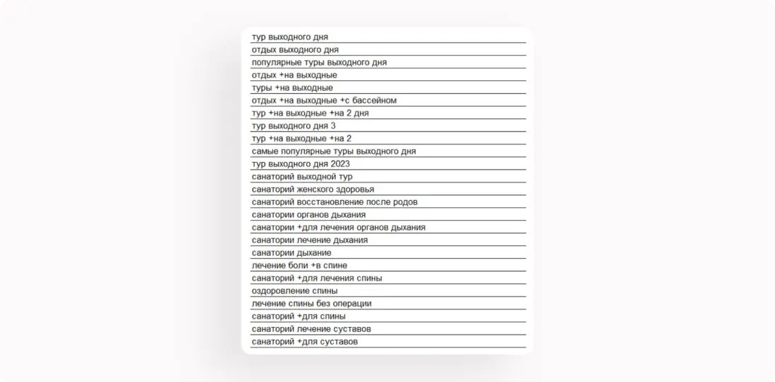 Для запуска рекламы в РСЯ не было необходимости собирать широкую семантику. Мы пересобрали ключевые фразы, которые заказчик использовал ранее: удалили неэффективные и низкочастотные запросы. Оставили только те слова и фразы, которые максимально соответствовали как тематике санаторного лечения, так и отдыха на выходные.