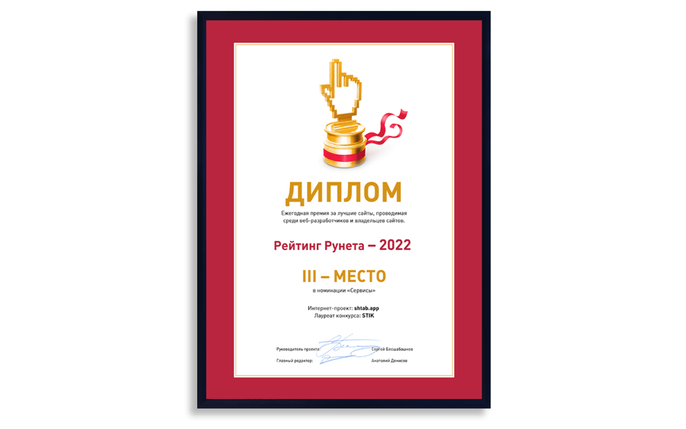 Мы подали Shtab на премию «Рейтинг Рунета» и взяли третье место в категории «Сервисы».