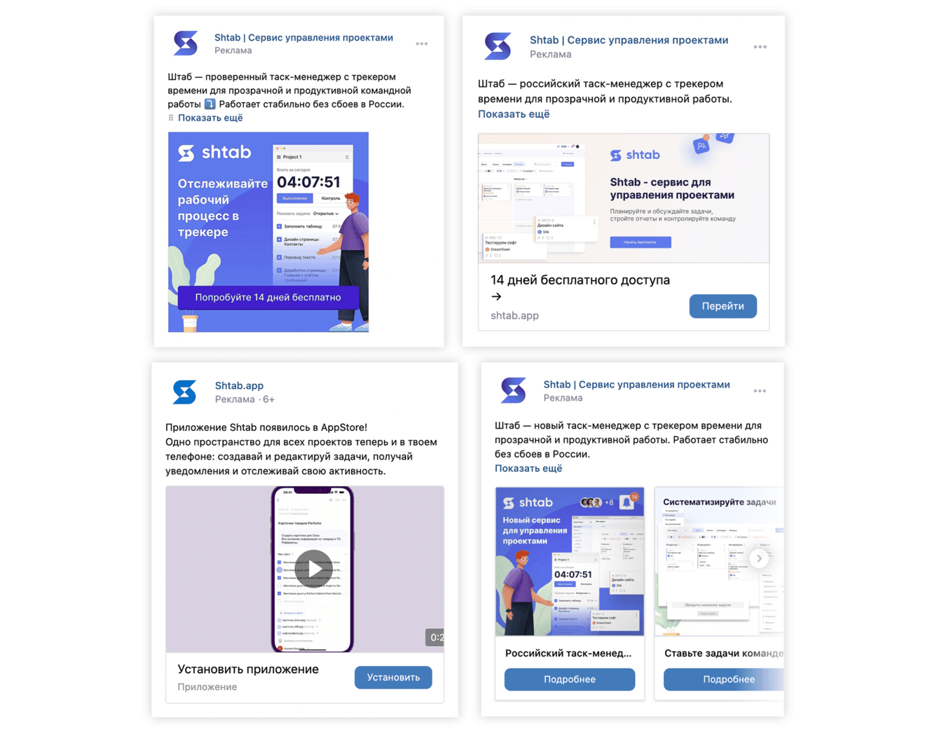 Мы тестировали разные группы интересов (бизнес, ПО и пр.), работали с ключевыми фразами, по аналогичным группам в контексте, собрали активные аудитории и подписчиков групп конкурентов и схожих сервисов. Писали объявления и показывали преимущества Shtab для разных групп специалистов (проджекты, бизнесмены, стартапы, маркетологи и т. п.).