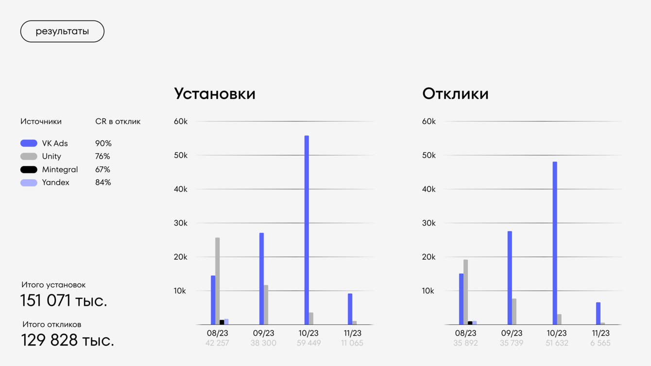 Яндекс Директ и Mintegral показали высокий CPI, поэтому мы сфокусировались на VK и Unity. В VK оптимизировались на отклики, что сразу дало CR 102%.