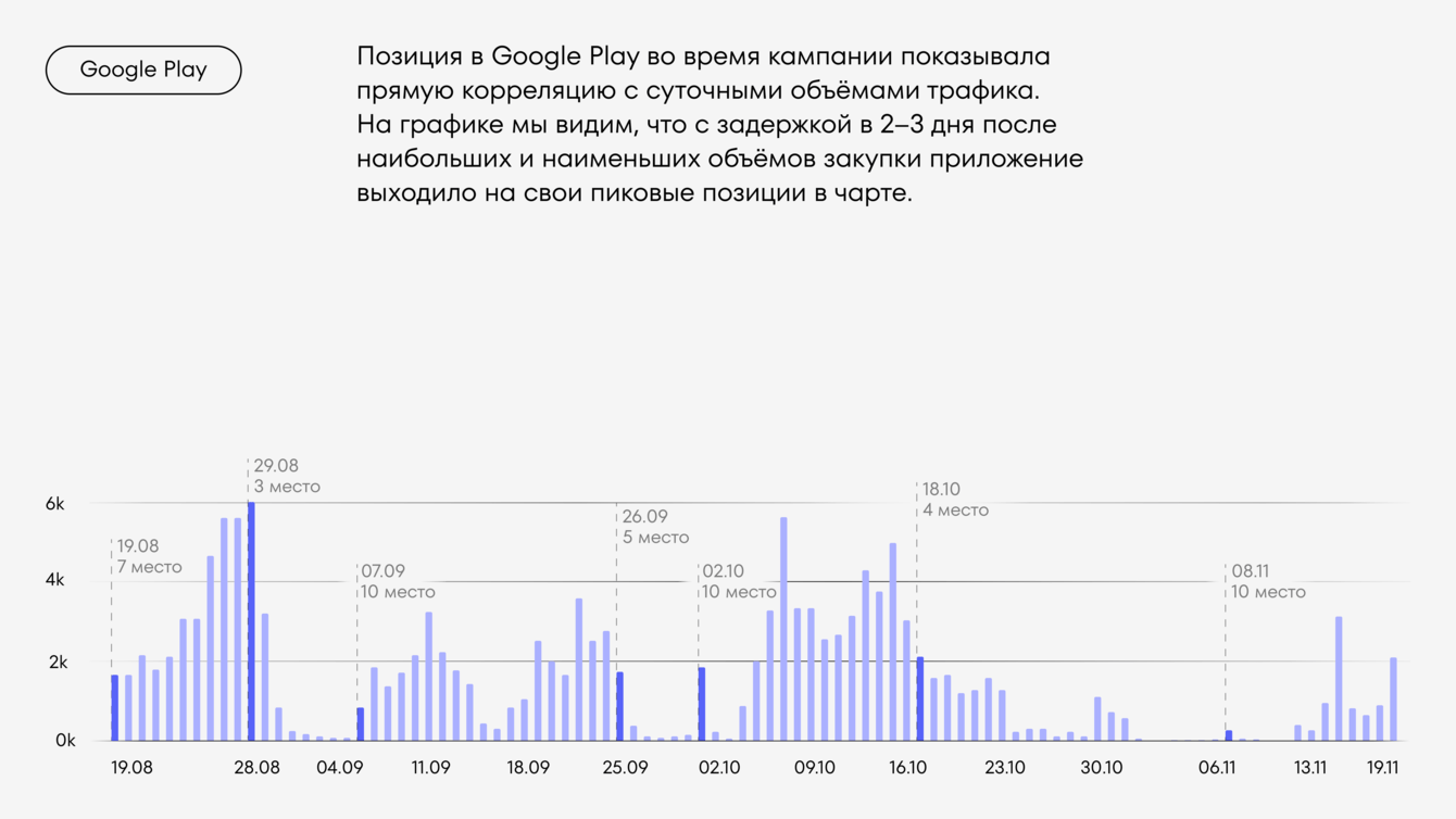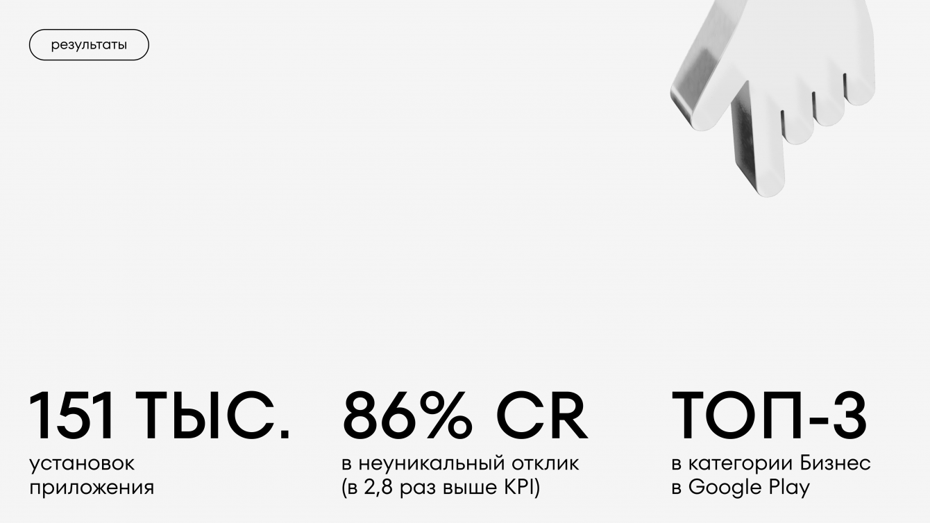 За первые две недели мы привлекли 42 тыс. пользователей, CR в неуникальный отклик составил 86%, в уникальный — 21%. Благодаря резкому скачку установок приложение вошло в топ-3 в категории Business Google Play.